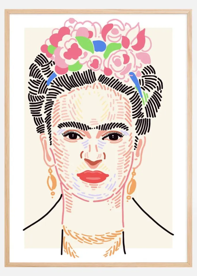 Denne karakteristiske plakat er en hyldest til kunsten at portrættere gennem sin brug af stærke linjer og levende farvekombinationer. Billedet er et modernistisk portræt fyldt med dristige mønstre og en rigdom af farver, inklusive pink, blå, gul og grøn mod en neutral baggrund. De livlige farver kombineres for at skabe et billede, der er både fremtrædende og fortryllende.