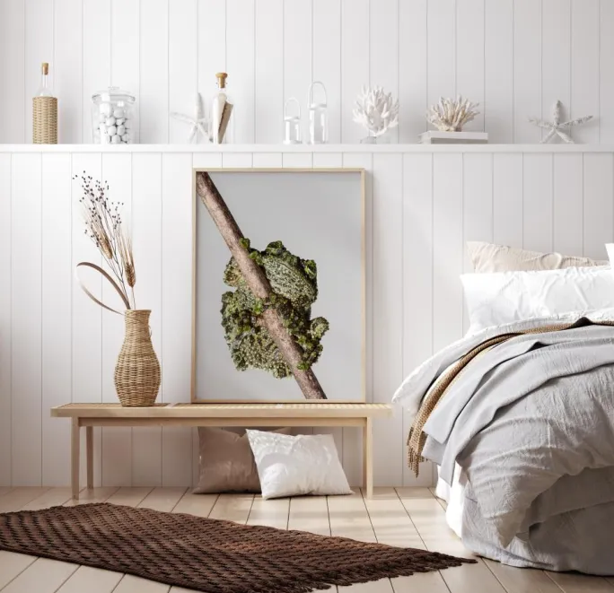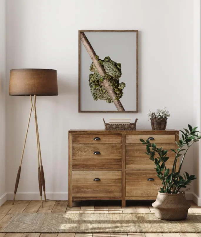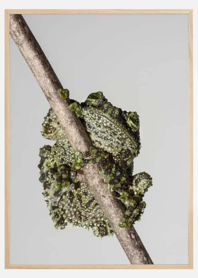 En makroplakat af en frø på et træ mod en lyseblå himmel. Detaljerne i alle frøens buler, knuder, vorter og alt muligt kan ses, mens den klamrer sig til den tynde gren. Øjnene og munden stikker ud over toppen i et sødt og elskeligt billede, der ville være hjemme på enhver væg.