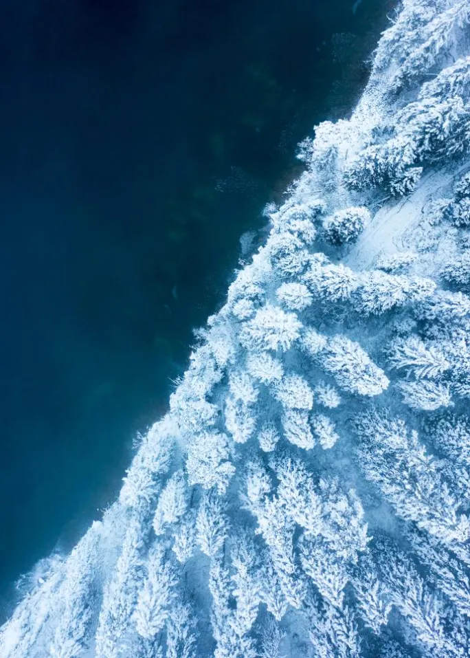 En spændende fotografisk plakat i fugleperspektiv, hvor et snedækket skov møder et blåfrossent hav i en skarp diagonal. En smuk naturplakat i kolde toner, perfekt at have som en del af et større collage.