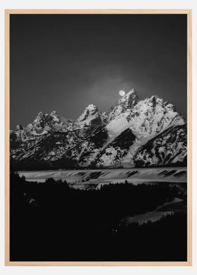 En dramatisk landskabsplakat med høje snedækkede bjerge mod en altødelæggende mørk himmel. Teton-bjergenes skarpe hvide toppe rejser sig fra en sort baggrund og skinner af hvid sne. Et måneskin lyser sneen endnu mere op. Tilføj dette til en hvid væg for et strejf af mørkt drama.