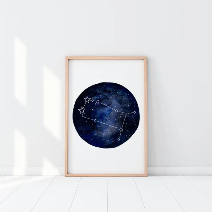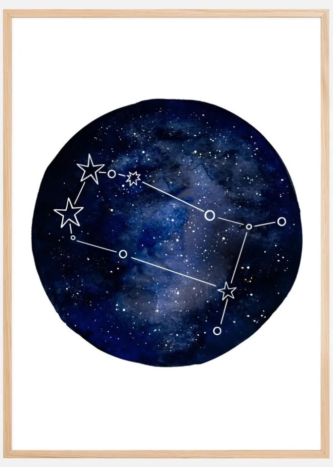 En horoskopplakat af stjernetegnet Tvillingerne. En stor mørkeblå cirkel indeholder en række blinkende stjerner. Tvillinge-konstellationen er tydeligt skitseret, så du kan se dit stjernetegn. Hæng denne op, hvis du er en tvilling og stolt af det.