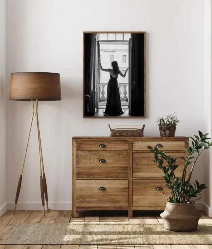 Et sort-hvidt fotografi af en kvinde i lang kjole stående ved vidt åbne altandøre, kiggende ud mod dagen. Foran hende anes slidte betonpiller og en slidt gammel facade. En plakat der ånder en skøn blanding af det smukke og levende i kontrast til det gamle og vejrbidte.