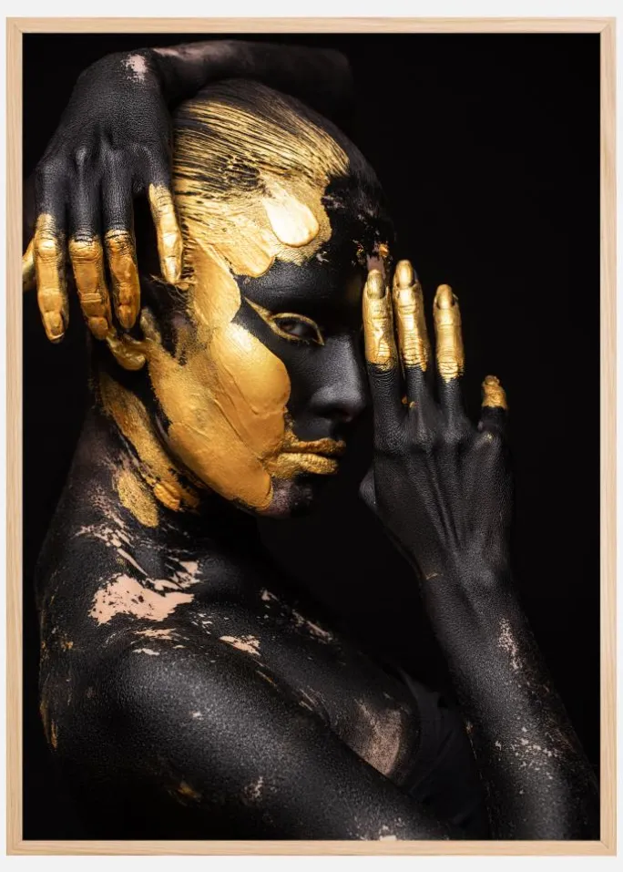En glødende portrætplakat af en kvinde i profil med den ene hånd holdt for ansigtet og den anden hånd draperet over hovedet. Kvinden er malet i sort og guld for at give en glødende effekt og få forskellige dele af hende til at skille sig ud, mens hun stirrer på dig fra øjenkrogen.
