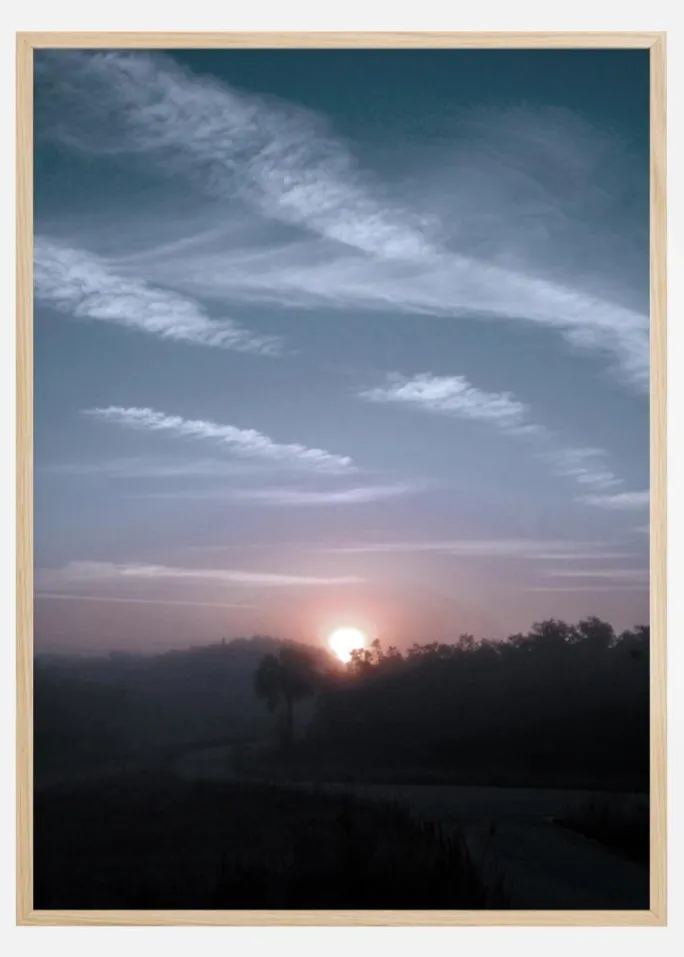 En lys plakat af morgenhimlen over et skovlandskab. En vej snor sig forbi et skovområde, og lige over toppen begynder en blød gul sol at stå op og kaste et blødt skær. Cirrusskyer fylder den blå himmel, mens alt lyser op. Mærk den tidlige morgenro i dette billede.
