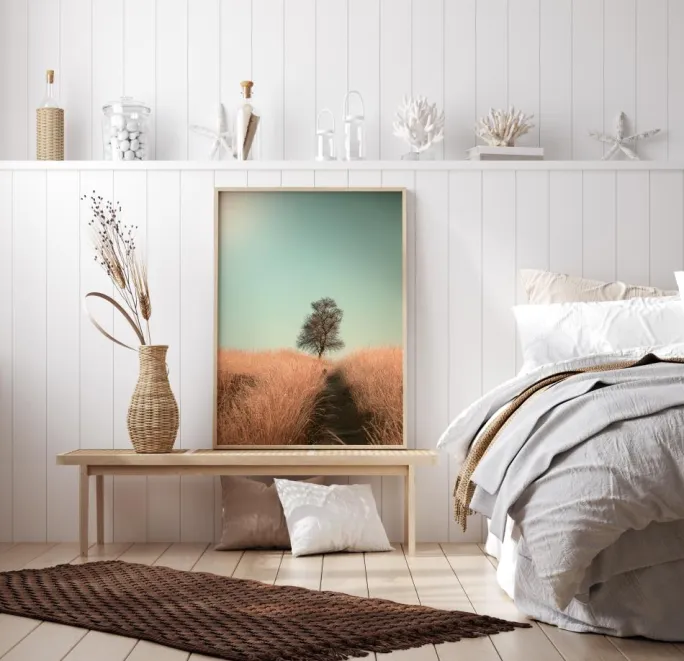En naturlig landskabsplakat med en blød græsmark med en sti, der skærer sig igennem den mod et enkelt træ i horisonten. Den enkelte sti tager dig med på en rejse til det ensomme træ. Til venstre oplyser et blødt sollys scenen fra den lyseblå himmel.
