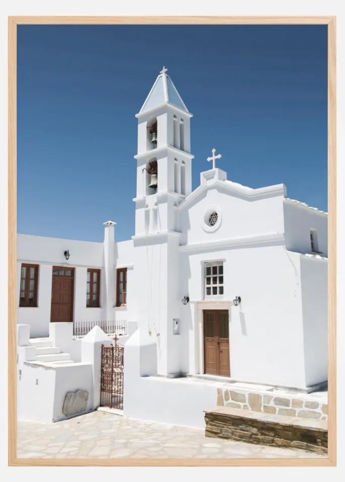 En arkitektonisk plakat af en hvid kirke i Grækenland på en fantastisk blå himmel. Den hvide og blå farve står i en klar og levende kontrast og bidrager til at skabe en følelse af eksotik i dette enkle, men overbevisende værk. Tag på ferie hjemmefra, når du hænger denne op.