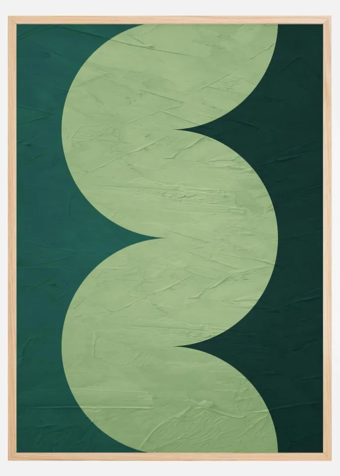 Denne abstrakte og kunstneriske plakat kendetegnes ved sit dristige grafiske design med svungne kurver, der skaber en legende og dynamisk følelse. De to grønne nuancer, en lysere pastel og en dybere skovtone, komplementerer hinanden og giver en følelse af liv og vækstkraft. Dette kunstværk giver et moderne touch og en frisk atmosfære til ethvert rum og er en hyldest til de naturlige nuancer af grønt, som vi finder i naturen.