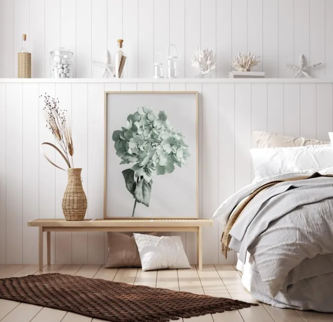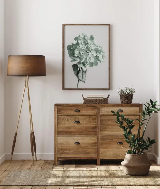Et smukt tryk, der forestiller en delikat, men let visnet hortensia. Valget af blege pastelfarver indfanger blomstens skønhed og giver den et strejf af melankoli. Dette yndefulde print, der forstærkes af en lyskilde, der kommer fra højre, er perfekt til et køkken.