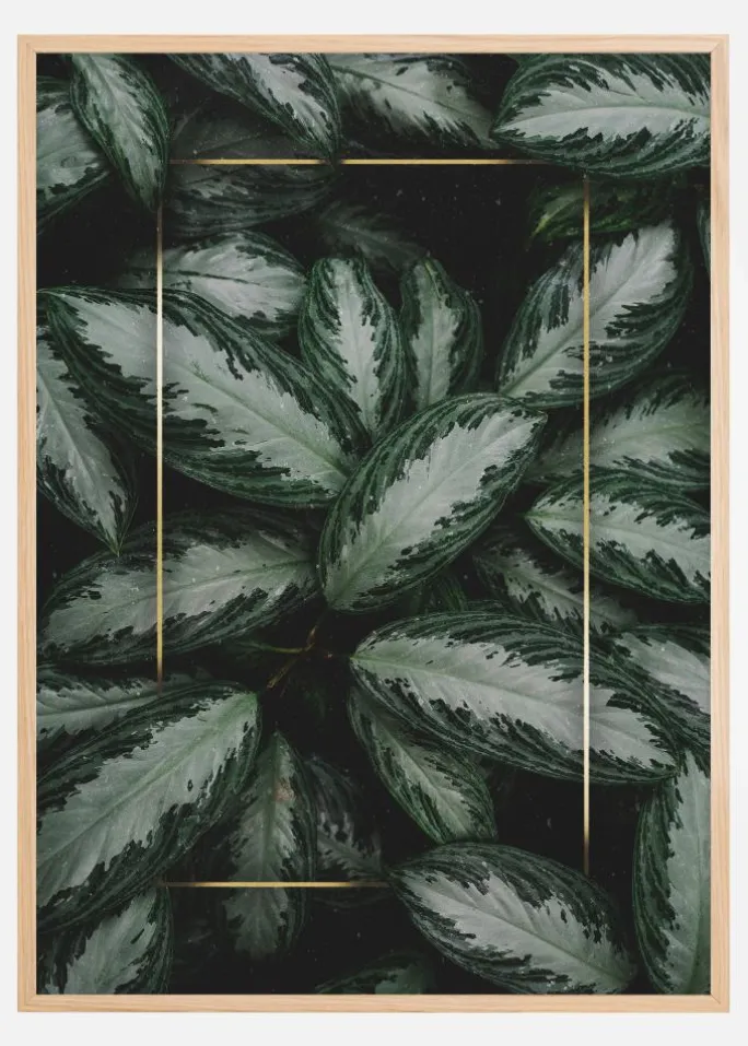 Med sine dristige og livlige grønne farvetoner, tilbyder denne plakat et forfriskende element af natur ind i dit hjem eller kontor. Motivets tætte samling af blade, hvis detaljerede mønstre i forskellige nuancer af grønt mod en mørk baggrund fremhæver deres naturlige skønhed. Hvert blads levende tekstur og kontrasterende mørke streger skaber en visuel dynamik der både er beroligende og energigivende. Dette print er en hyldest til naturens enkle men komplekse design, ideel til dem der ønsker at indføre elementer af det naturlige og organiske i deres indretning.