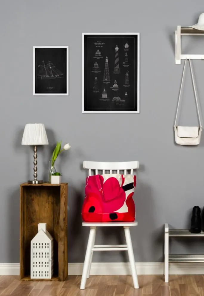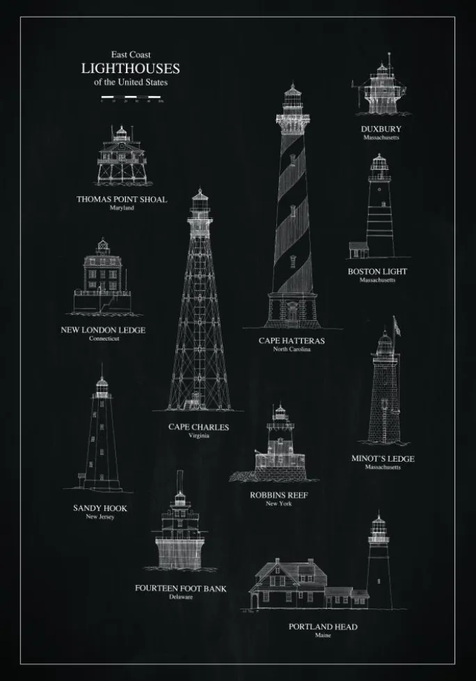 Lad dine vægge følge et maritimt vintage-tema og dekorer dem med vores prints som har motiver af fyrtårne og skibe! Denne originale print bringer tankerne hen på en sort kridttavle med et lækkert motiv, der ser ud til at være tegnet med en tynd, hvid kridt. Motivet skildrer 11 smukke fyrtårne, der er beliggende langs USA’s østkyst. En drøm for dig, der kan lide arkitektur og tegninger! Da printet findes i en række forskellige størrelser, finder du nemt en, der passer ind i netop dit hjem. Komplementér gerne med en hvid eller guldfarvet ramme.