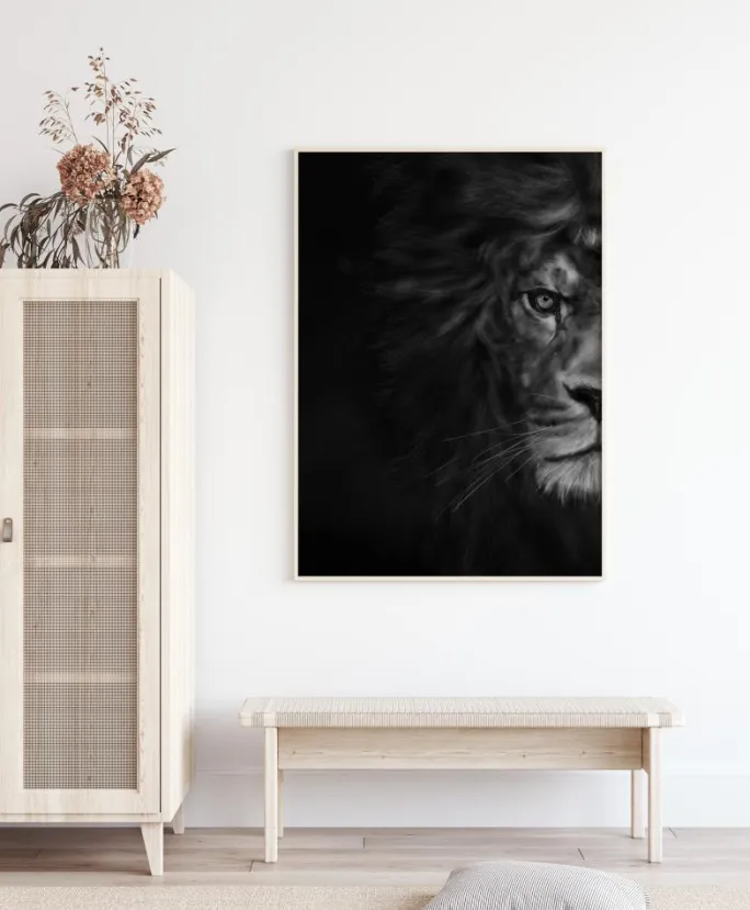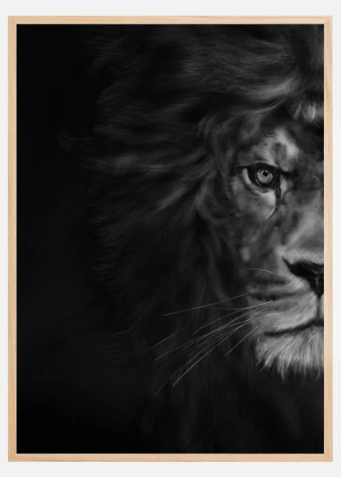Et imponerende sort-hvidt dyreprint af en glubsk løve, der stirrer direkte ind i kameraet. Placeret til højre for printet er kun halvdelen af løvens ansigt synligt. Med sin smukke bølgede manke og majestætiske positur kan han helt sikkert defineres som junglens konge. Bring safari-følelsen ind i dit hjem.