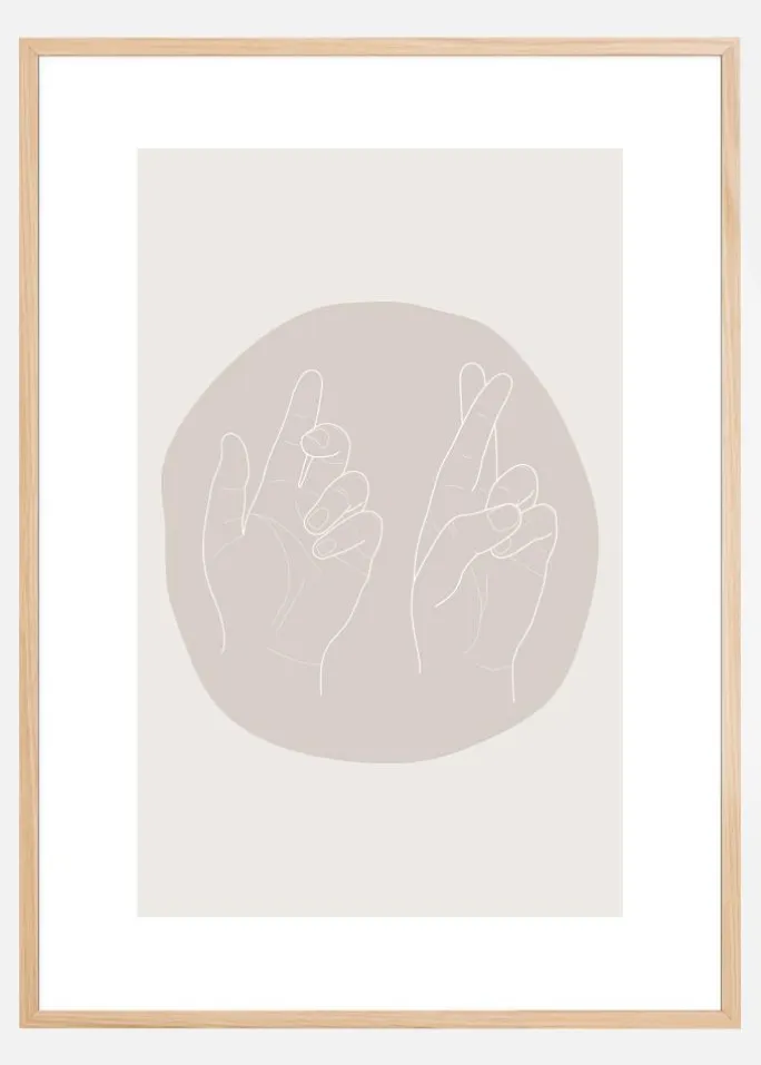 Et enkelt print af to venstre hænder på en cirkulær beige form. Cirklen er monteret på en nudefarvet baggrund med begge hænder pegende mod toppen af printet. Hænderne er afslappede, hvilket skaber en rolig stemning i dit hjem. Det perfekte print til dit arbejdsværelse.