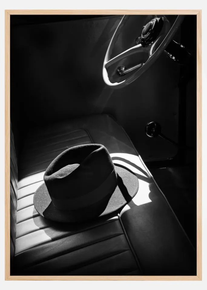 Denne sofistikerede sort-hvide plakat fanger essensen af vintage elegance med sin tidløse fremstilling af en klassisk filthat placeret på sædehynden i en gammel bil. Motivet, omhyggeligt indrammet af skygger og spil af lys, skaber en atmosfære af nostalgi og luksus. De dristige kontraster mellem det sorte lædersæde, det skinnende kromede rat og den ikoniske hat fremhæver de klassiske toner af sort, hvidt og gråt i billedet.