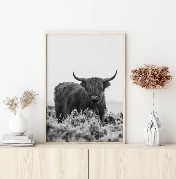 Et smukt dyreprint, der forestiller en ensom ko på heden. Omgivet af højt græs stirrer dette storslåede dyr lige ind i kameraet. Når den står mod en grå himmel og højt græs, kan du næsten mærke den kolde vind i ansigtet. Det perfekte print til enhver dyreelsker.