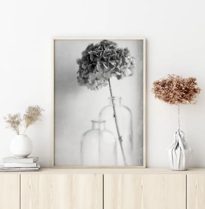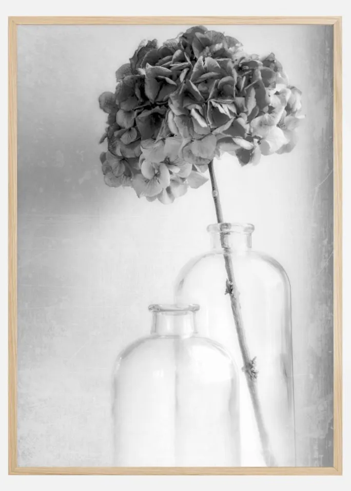Et smukt naturprint af en enkelt stængel af hortensia i en gennemsigtig vase. Foran et blomstret hvidt gardin falder et sart lyserødt kronblad. Både en let vind og gardinet blæser. Mærk den kølige brise i dette billede.