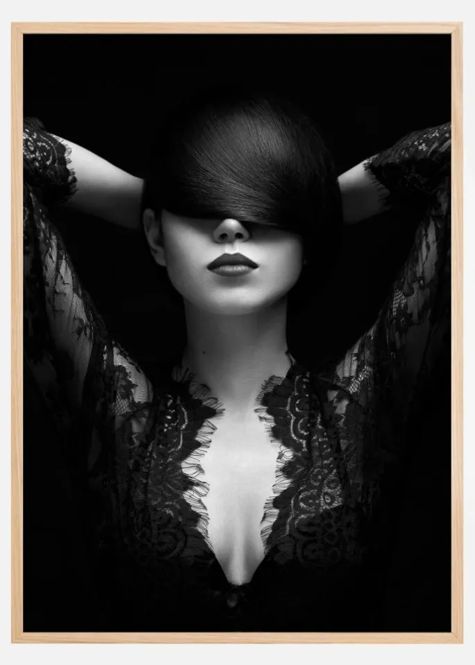 Et fantastisk portræt af en smuk kvinde i en lavt udskåret sort kjole. Med hænderne knyttede bag hovedet dækker kvindens skinnende hårgrænse begge hendes øjne. Med perfekt formede læber poserer kvinden i et meget alvorligt humør. Et perfekt print til at hænge på en hvid væg.
