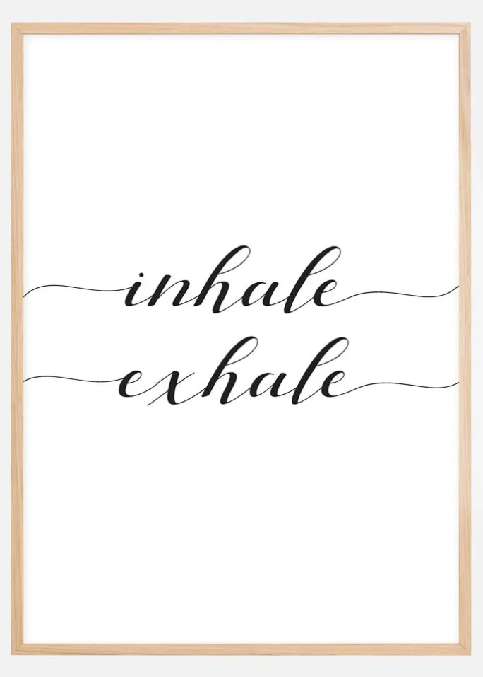 Et motiverende print med et enkelt budskab. Indånde og udånde. Et positivt budskab til at formidle ro og tålmodighed. De sorte ord er skrevet i en elegant skrivestil og står på en hvid baggrund. Det perfekte print til at formidle et positivt budskab og bevare roen, uanset hvad der sker.