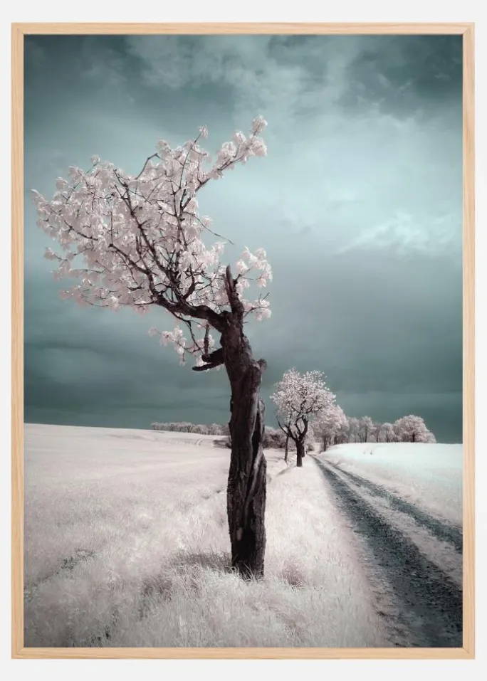 Et elegant print af et blomstrende træ omgivet af pinkfarvet græs. Den enkelte sti fører dig mod en lille skov med blomstrede træer. Den bløde turkisfarvede himmel møder de lyserøde marker i horisonten. Nyd skønheden i dette bløde print i pastelfarver