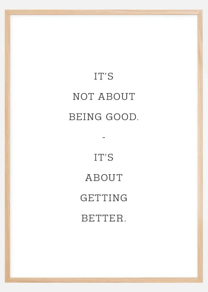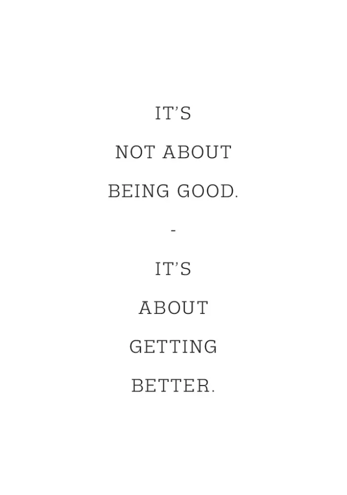 Et sort-hvidt motivationsbillede med et enkelt, men effektivt budskab. Det handler ikke om at være god, det handler om at blive bedre. Et simpelt budskab om opmuntring til at se livet roligt i øjnene med det formål at forbedre sig i de daglige gøremål. Et budskab om opmuntring til læseren.