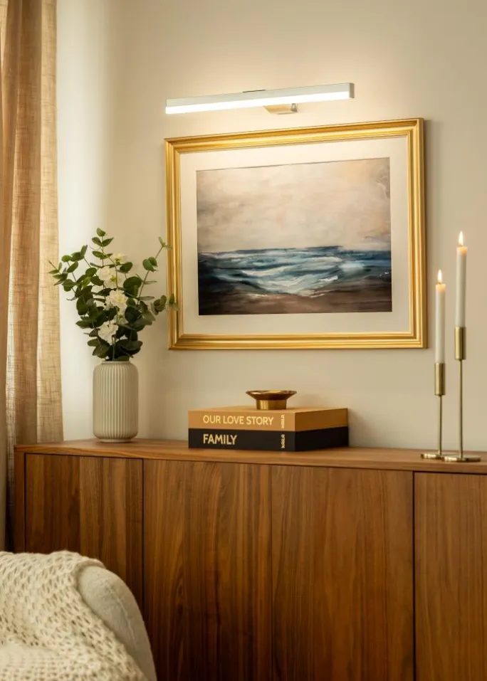 Med sin stilrene sølvfarve passer denne maleribelysning ind i de fleste indretninger og giver et moderne indtryk. Belysningen styres nemt med en medfølgende fjernbetjening, der lader dig justere lysstyrken samt indstille en timer med valgbare intervaller på 15, 30 eller 60 minutter, hvilket er en praktisk måde at spare batteri på.