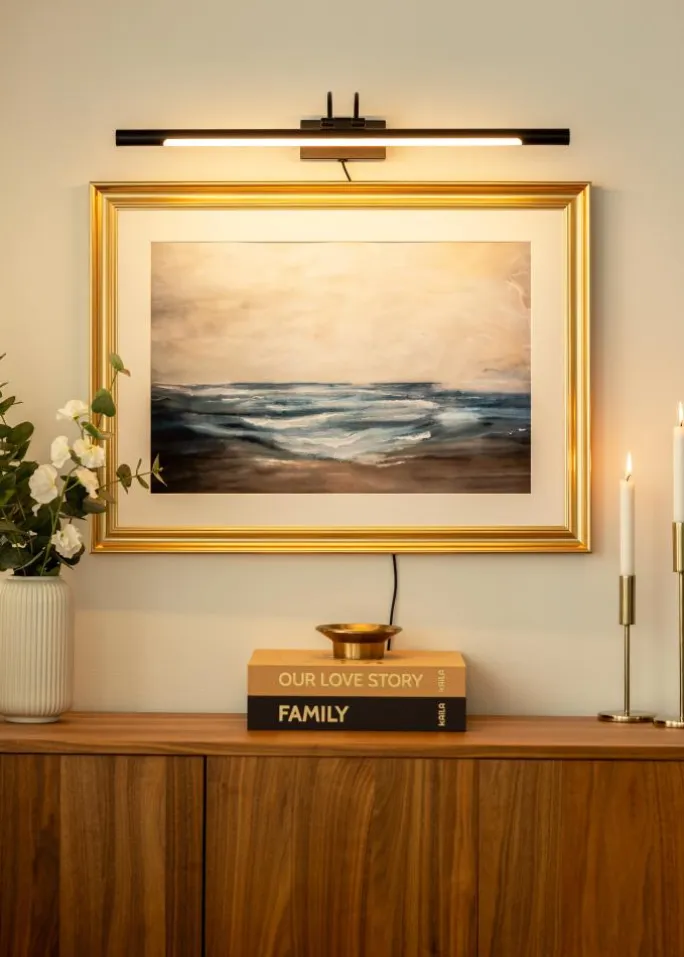 Denne sorte billedbelysning kombinerer moderne elegance med praktisk funktionalitet, hvilket gør den til et perfekt valg for at fremhæve dine kunstværker og fotografier. Med en dybde på 19 cm og en længde på 68 cm er den velegnet til at belyse billeder med en maksimal bredde på 110 cm. Belysningen har en integreret LED-lyskilde, der giver et blødt og varmt lys på 3000K, hvilket fremhæver detaljer uden at forårsage blænding. Med en lysstyrke på 780 lumen giver den en jævn lysfordeling, der ikke overvælder, men snarere skaber en behagelig atmosfære omkring dit kunstværk.
