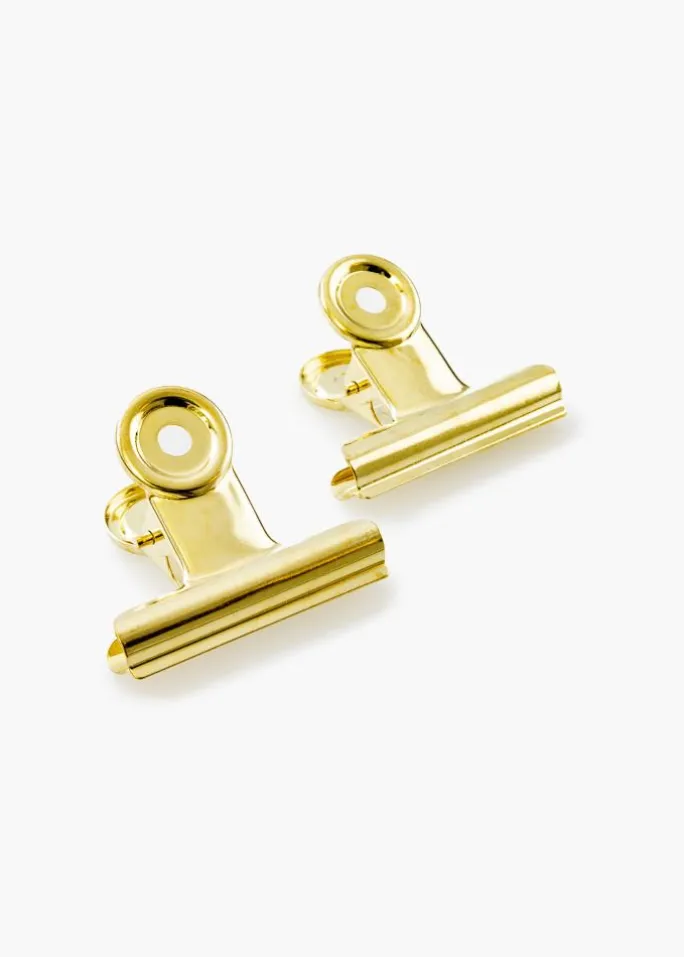 En metalklemme i en elegant og blank guldfinish som giver mulighed for at hænge dine plakater og posters op på en smart og enkelt måde. Posterklemmens design er stilrent, og hullerne i klemmens runde top gør det enkelt at hænge den på væggen på et lille søm eller en skrue. Klemmens åbning har et godt greb som gør at du kan hænge selv det allertyndeste papir op, samtidigt som den også er fleksibel og muliggør montering af motiver i varierende tykkelse. Har du en stor plakat som du vil hænge op, så kan du anvende to metalklemmer for bedste resultat.