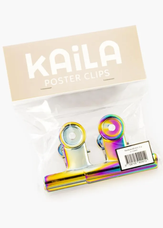 En flot regnbuefarvet metalklemme i en blank finish som gør det muligt at hænge dine plakater og posters op på en smart og lidt anderledes måde. Posterklemmens kraftige, men fleksible, åbning gør, at du kan fastgøre det allertyndeste papir såvel som plakater som er lidt tykkere. Har du en stor plakat, som du vil hænge op, så er det bare at anvende to metalklemmer. Posterklemmens design er stilrent og enkelt, og takket være hullerne i klemmens runde top kan du nemt hænge den op væggen ved hjælp af et lille søm eller en skrue.