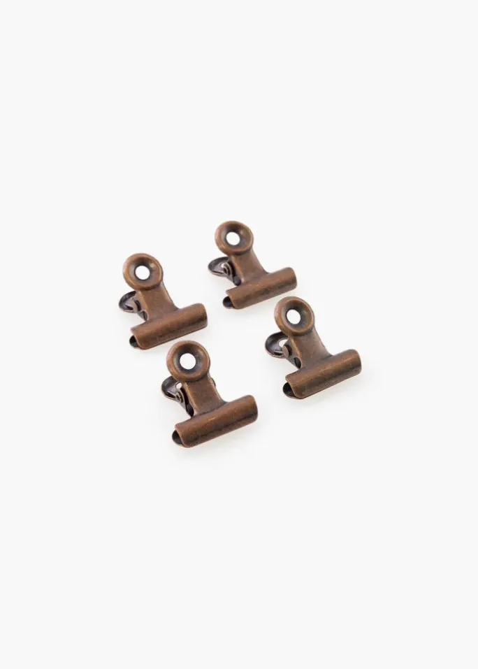 Dette er en rustik metalklemme med et flot, slidt messinglook som giver mulighed for en smart ophængning af plakater eller posters. Monteringen på din væg er også meget enkel takket være hullerne i posterklemmens elegante, runde top. Klemmens åbning giver et fleksibelt, men kraftigt greb som gør at du kan montere tyndt papir såvel som plakater der er lidt tykkere. Vil du hænge en stor plakat op, kan du altid vælge at anvende to metalklemmer.
