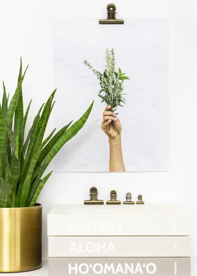 Denne stilfulde metalklemme giver dig mulighed for på en enkel og smart måde at hænge plakater og prints på væggen. Denne flotte bronzefarve med et lidt slidt look tiltaler måske endda dig som kan lide rustikke indretningsdetaljer. Klemmens åbning har et godt, men også fleksibelt greb som gør, at du kan fastgøre både supertyndt papir, men også plakater med lidt kraftigere tykkelse. Har du en plakat i et lidt større format som du vil hænge op, kan du bare anvende to metalklemmer. Monteringen på din væg er let, takket være hullerne i posterklemmens stilfulde, runde top.