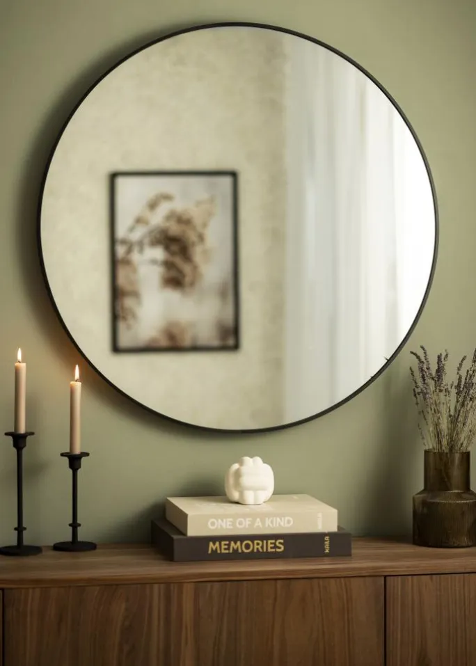 - Rundt spejl med dyb ramme i mat sort metal