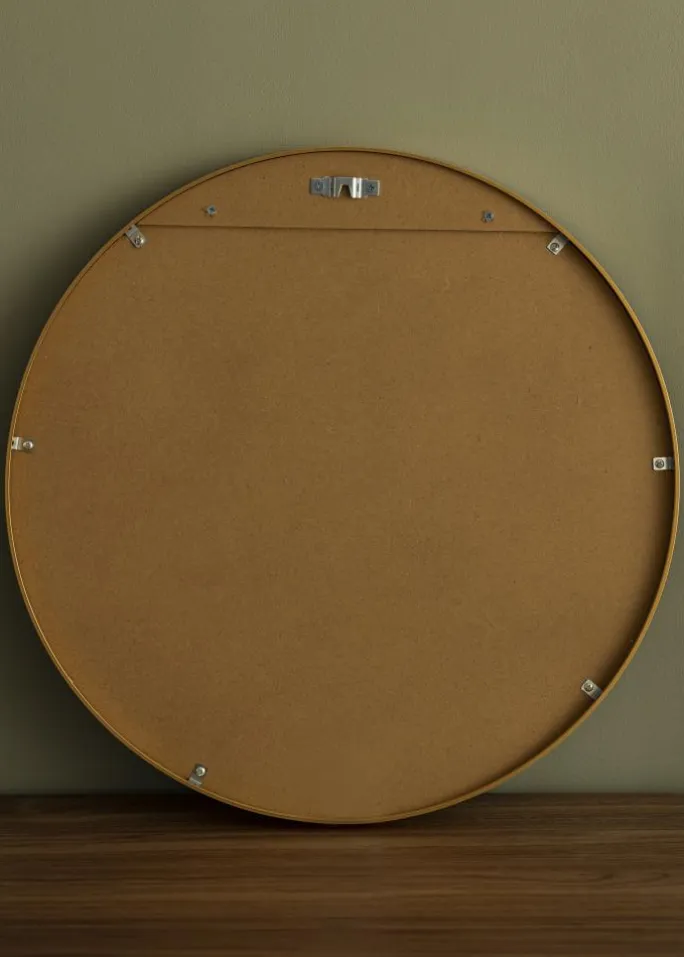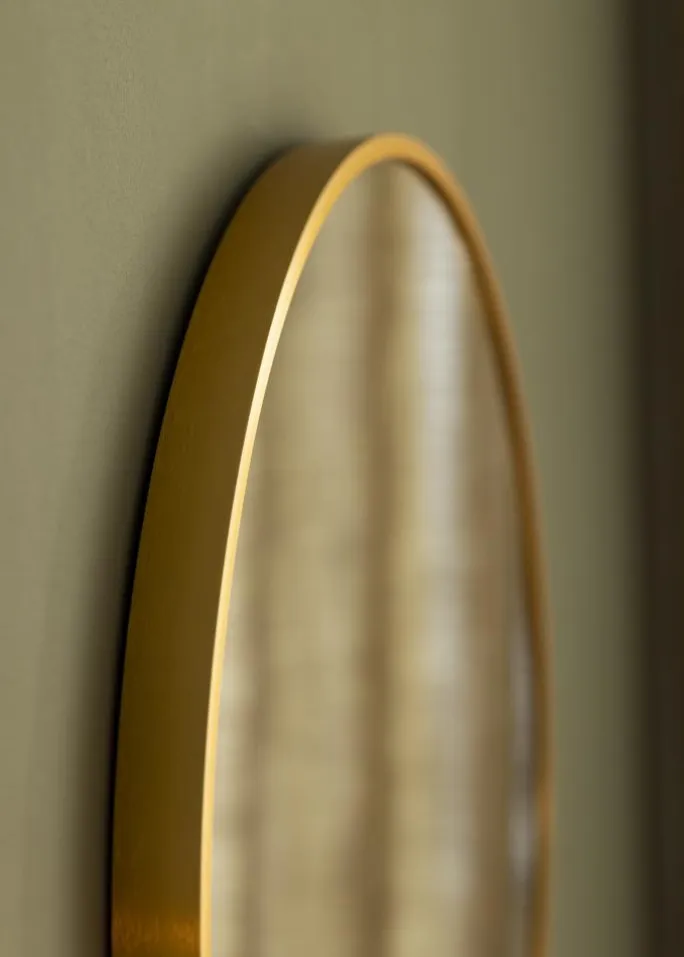 - Rundt spejl med dyb ramme i guldfarvet metal