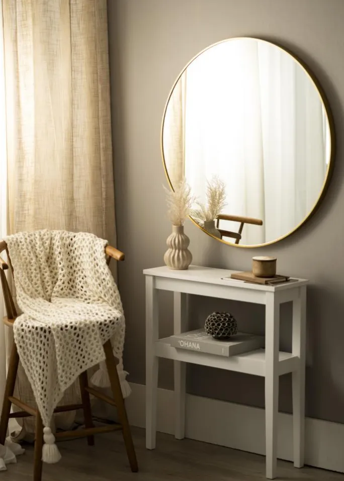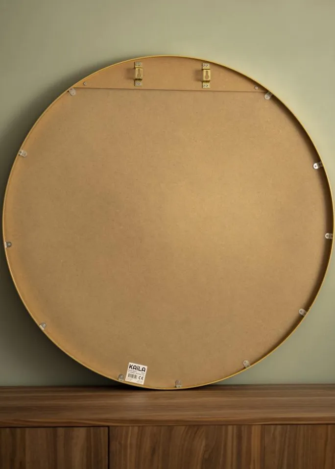 - Rundt spejl med dyb ramme i guldfarvet metal