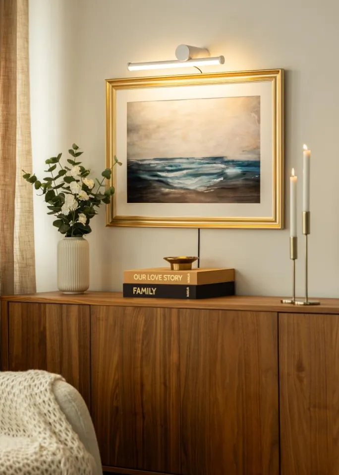 Med sit rene og moderne hvide design er denne billedbelysning et diskret og stilfuldt alternativ for at fremhæve dine malerier eller fotografier. Lyset spreder sig blødt og jævnt over kunstværker op til 80 cm i bredde, hvilket gør den til en alsidig løsning for både hjem og kontor. Med sine mål på 40 cm i længde og 15,3 cm i dybde er belysningen tilpasset til at sidde flot over billedet uden at trække for meget opmærksomhed fra kunstværket.