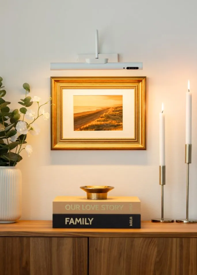 Med en dybde på 14 cm og en længde på 35 cm er den kompakt og let at installere, uden at tage over visuelt. Den kan belyse kunstværker med en maksimal bredde på op til 60 cm og leverer en jævn lysfordeling. Lysstyrken kan varieres mellem 262 og 300 lumen, hvilket giver en balanceret belysning, der fremhæver detaljerne i kunsten uden at være overvældende.
