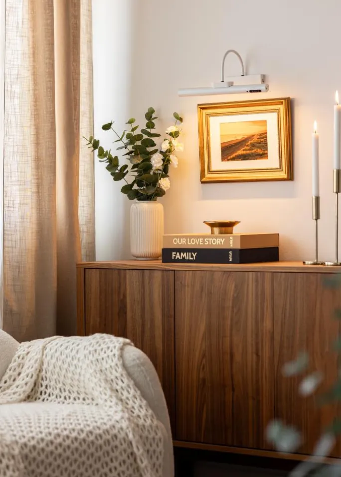 Denne batteridrevne billedbelysning i hvidt design er både praktisk og stilren. Med muligheden for at undgå synlige ledninger kan du placere den præcis der, hvor den behøves for at fremhæve dine kunstværker på bedste måde. Belysningen har en LED-lyskilde, der giver et behageligt lys og som kan justeres i tre forskellige farvetemperaturer (3000K, 4000K, 6000K), afhængigt af hvad der passer bedst til lige dit kunstværk og miljø.