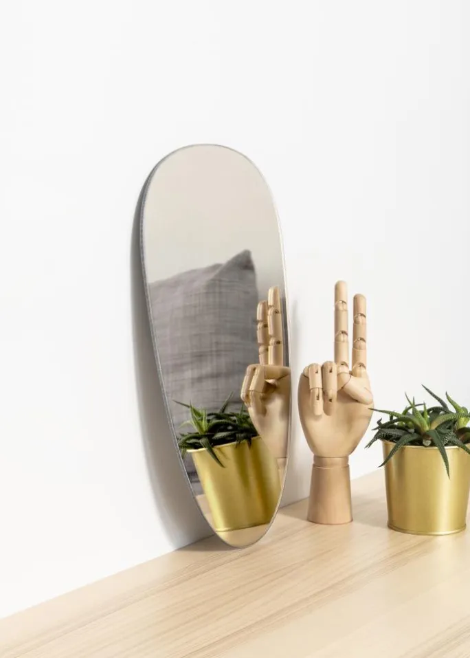 Du får her et spejl med en spændende og lidt anderledes form, som vil gøre et trendy indtryk i dit hjem! Derudover måler dette asymmetriske spejl kun 4 mm i tykkelsen og har ingen ramme, hvilket giver det en meget delikat og elegant fremtoning.