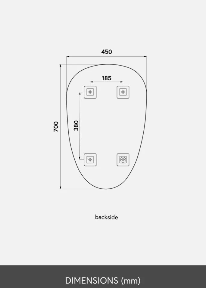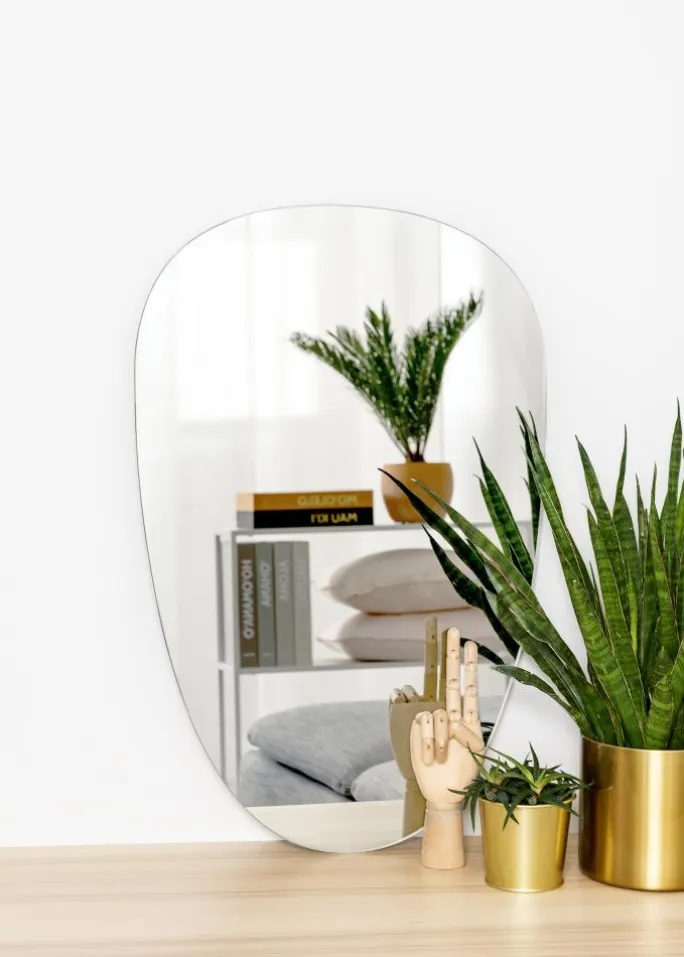 Et stilfuldt og interessant spejl som dette bliver et moderne indslag i din boligindretning! Spejlet har en blød og asymmetrisk form, der nærmest kan beskrives som ujævnt oval. Spejlet er desuden meget tyndt og har ingen ramme, hvilket forstærker spejlets elegante fremtoning.