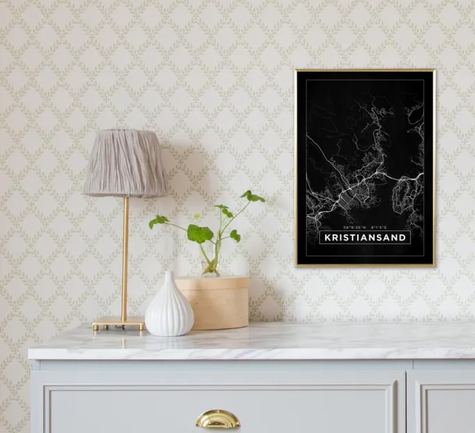 Gør væggen super fin og rummet hyggeligt med denne flotte plakat med et kort! Kortet har et moderne design med minimalistiske linjer samt byens navn og koordinater. Vælg mellem 3 forskellige farver og hele 8 forskellige størrelser!