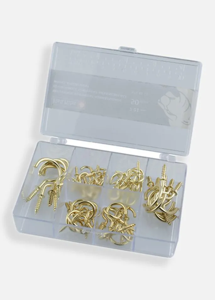 Dette krogsortiment indeholder 50 messingbelagte kroge i størrelser mellem 7–21 mm. Perfekt til forskellige typer ophængninger i hjemmet, uanset om det gælder malerier, dekorationer eller andre små detaljer. Et praktisk sæt til dig, der ønsker en nem og stilren monteringsmulighed.