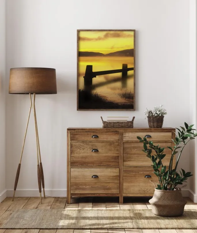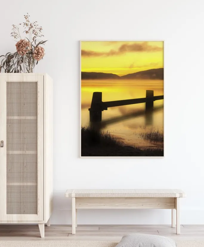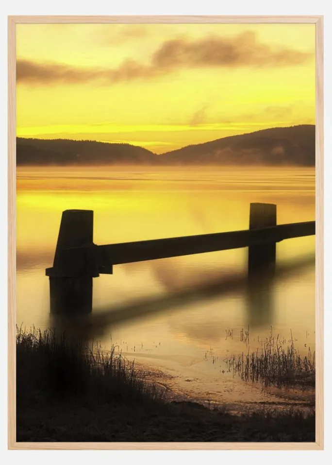 En naturskøn plakat af en smuk gylden sø ved solnedgang. De levende orange toner gløder på søen og skaber en varm beroligende atmosfære. De mørke bakker i det fjerne forsvinder næsten til midten af billedet, hvilket giver en følelse af dybde. I forgrunden rager en træstruktur ud af vandet. Nyd stilheden i dette billede.