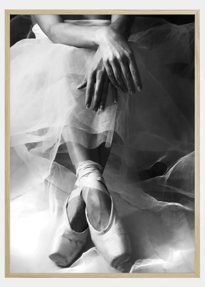 En elegant plakat med en ballerina, der poserer siddende før en dans. Følg de krydsede fødder og hænder, mens hun venter på, at det bliver hendes tur. Denne plakat er den perfekte tilføjelse til en neutral væg.