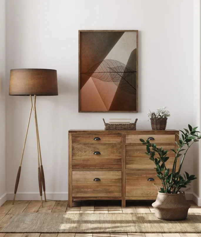Et fantastisk billede af to blade gengivet mod sollyset. Lysstrålen fremhæver bladrenes årer. Det smukke billede er domineret af forskellige brune nuancer, mens baggrunden er præget af både ru og glatte partier, der reflekterer lyset. Et ideelt print til at give lys til et rum.