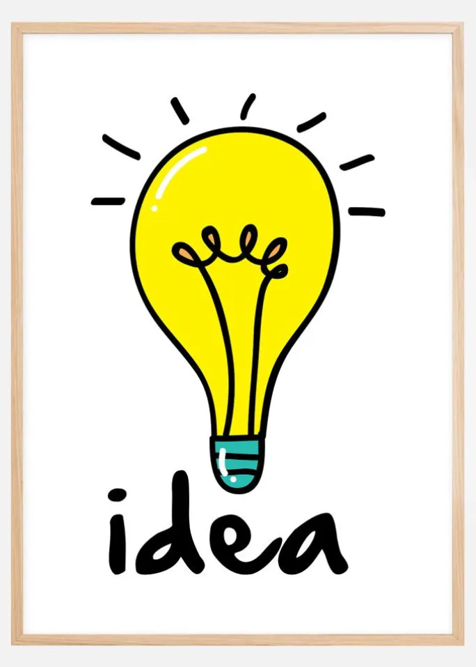 Kender du nogen, der altid er fuld af vilde ideer? Her har du den perfekte gave at give til geniet. Plakaten, med en illustration af en tændt pære og ordet ‘idé’ på engelsk, har en tegneserie-fornemmelse og passer godt til at hænge sammen med andre grafiske posters i samme stil. Komplementer printet med en flot sort billedramme med en tyndere profil, der fremhæver motivet og forstærker den naive fornemmelse i billedet.