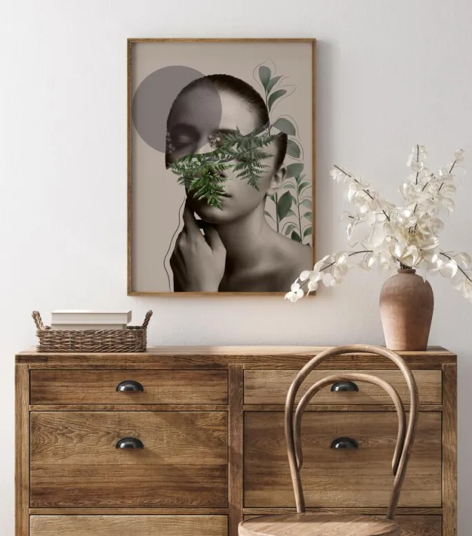 Dette smukke portræt er inspireret af decoupage-kunsten. Forskellige billeder er sat sammen for at skabe et moderne, stilfuldt kunstværk. Den unge pige på billedet er omgivet af smuk botanik, som skaber en følelse af fred og ro. Et ideelt maleri til et avantgarde soveværelse eller en minimalistisk stue.