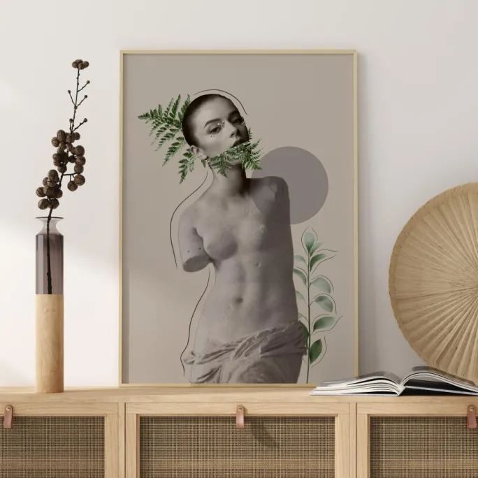 Et udtryksfuldt billede, der gør decoupage motivets skønhed. Hovedpersonen er en smuk kvinde omgivet af botanica på en gammel græsk statue. En delikat kontrast mellem moderne og antikke tidsaldre. Dette billede er et statement accent til en minimalistisk stue.