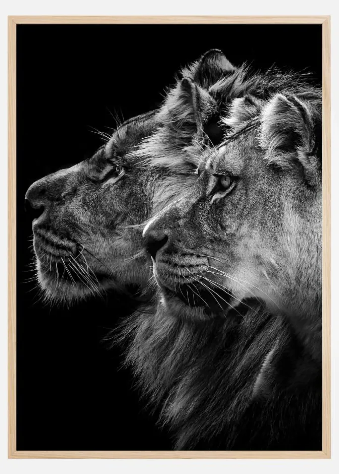 Et fængslende sort/hvid print af en løve og en løvinde. På en sort baggrund har disse storslåede væsner et opmærksomt blik. Det naturlige lys skinner på væsenets kæbelinjer, hvilket får dem til at virke endnu mere dominerende. Et ideelt print til enhver dyreelsker.