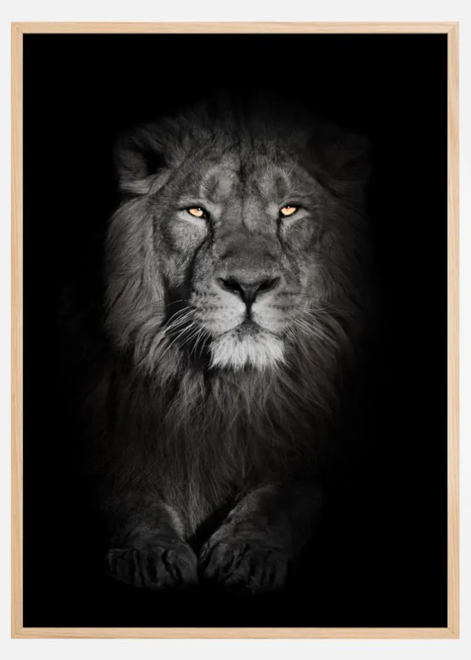 Overfor denne mægtige plakat står man ansigt til ansigt med selve kongen af junglen. En statelig løve, fanget i et portrætbillede, der viser dyrets majestætiske udstråling. Billedet er taget i sort-hvid, hvilket giver en tidløs og dramatisk følelse. Løvens gennemtrængende blik og detaljerede manke er dygtigt fremhævet mod den dybe sorte baggrund, hvilket giver plakaten en næsten tredimensionel dybde.