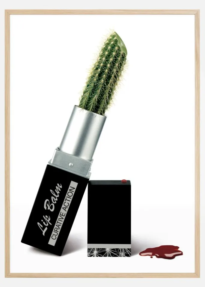 Et smertefuldt men sjovt skønhedsprodukt print. På en hvid baggrund er der en sort/hvid læbepomadestift med en kaktus på en hvid baggrund. Med læbepomadestiften lænet mod dens top er der en enkelt rød dråbe og et stænk af rødt ved siden af toppen. Vær forsigtig, når du tager din læbestift på.