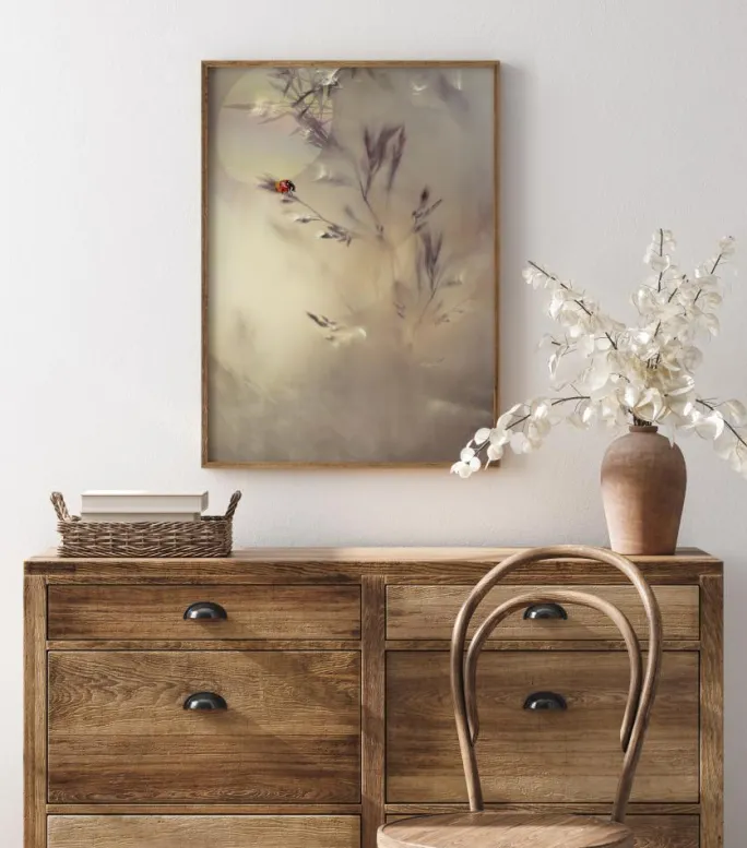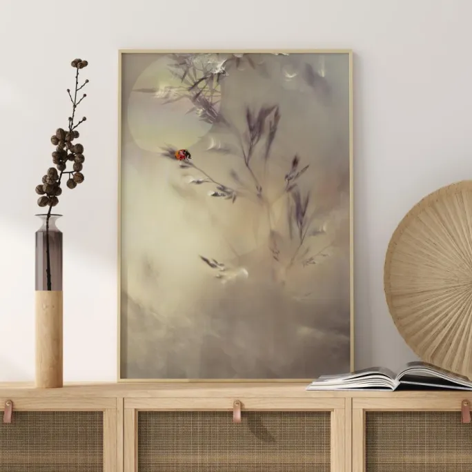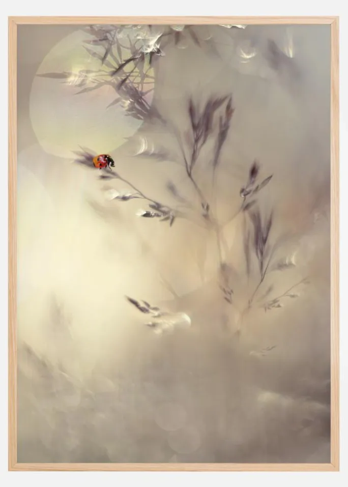 Et tåget billede af en smuk mariehøne på et tørret græs. Med sollyset, der reflekteres i det fjerne, træder mariehønenes lyse sorte og røde farver tydeligt frem. De smukke tågede farver giver en følelse af fred og ro. Et smukt print til at hænge i et soveværelse.