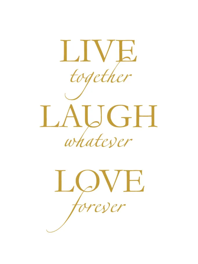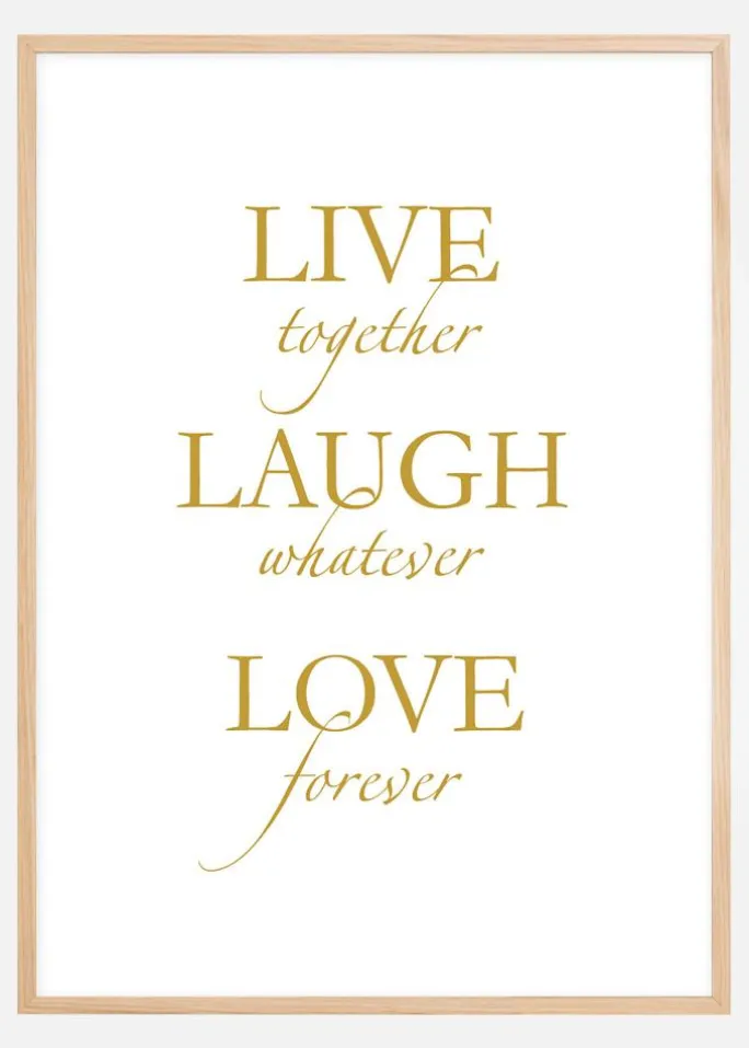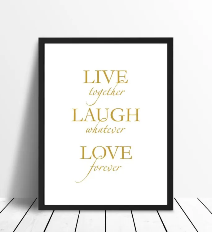 Opfindsomt print der opfordrer til at leve livet og sprede glæde. Mod den hvide baggrund skinner den guldfarvede skrifttype og giver glans til indholdet, som med sit positive budskab fortjener en plads af ære i hjemmet. Placer printet i et rum, der bruges ofte, hvor det kan fungere som en påmindelse om mere lykke i livet, gerne sammen med andre guldfarvede tilbehør.